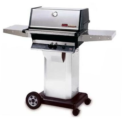 This MHP propane gas grill features a high profile stainless steel lid with solid aluminum end-caps for greater stability 433 1/2 square inches of primary bbq grill area (642 total area including stainless warming rack) 40,000 BTU stainless H-type dual burner 5/16 inch 2-piece stainless rod cooking grids 2 folding stainless side shelves and electronic ignition. Includes stainless column and black cast aluminum base with 8 inch wheels and locking casters. Includes propane hose and regulator with fuel level gauge and stainless grease cup for easy clean-up.